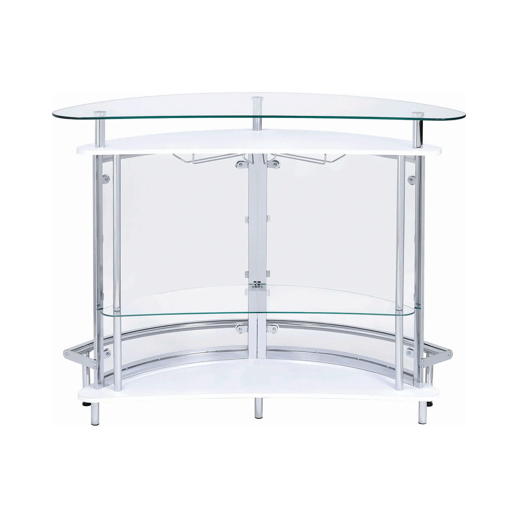 Upgrade your home entertainment options with this gorgeous, contemporary bar unit. With a convenient wine glass rack and ample storage space, it easily accommodates a wide variety of stemware, bar accessories, and cocktail ingredients. Graceful and glamorous, its curved silhouette is beautifully accentuated with gleaming chrome accents. A large, tempered glass top gives you plenty of prep space to mix delicious drinks for your guests. Complete with clear acrylic panels, this stylish unit allows you to show off your collection of fine wines and spirits in style.