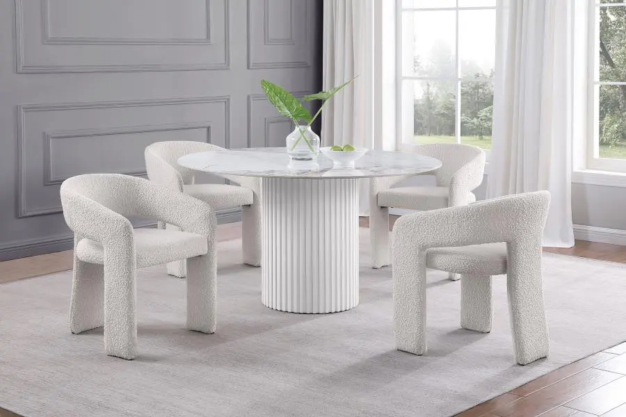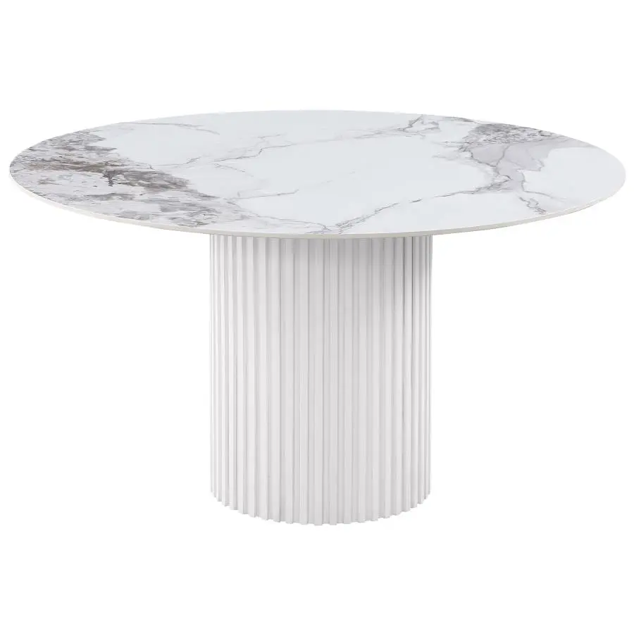 Bring polished sophistication and lasting durability to your kitchen or dining room with a modern dining table. It’s crafted from sintered stone, a synthetic surface crafted from minerals exposed to heat to create an authentic look for white marble. Subtle gray veins add depth and detail to the tabletop. Underneath, a gray finish pedestal features a round silhouette and vertical reeded details that add contrasting texture to the smooth tabletop. This striking dining table is an elegant choice, offering fresh, clean ambiance to your breakfast nook or dining room.