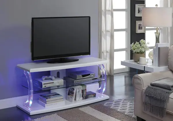 Enhance your entertainment area with the Aileen TV Stand. This sleek rectangular stand features a white finish table top and base with contemporary acrylic posts and a tempered glass shelf. This elegant Etagere frame is accented with LED lighting and two open shelves providing ample space for storage and display.