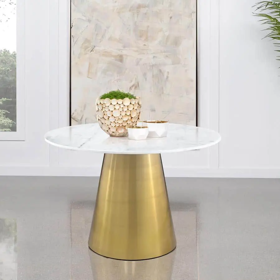 Freshen up your elegant dining room with the luxurious look and feel of genuine marble. This modern dining table pairs a round silhouette with beautiful white marble complete with light grey veining that offers organic elegance and dimensionality. This striking table stands on a conical pedestal base that receives a gleaming gold finish that radiates warmth and sophistication. This table is a stunning addition in a formal dining space, offering refined character to family and friends. The pairing of cool marble and warm brushed gold strikes a perfect balance.