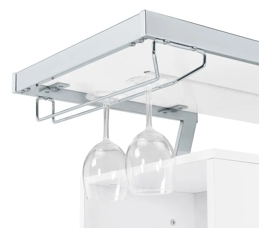 Pull out all the stops to breathe fresh energy and organization into a casual space dedicated to entertainment. Your needs are met with this modular-inspired and contemporary home bar constructed of MDF, paper coating, and veneer, all with a bright white finish. Metal framing is jazzy with a geometric motif, supporting a spacious top shelf ideal for beverage and snack prep. A center compartment features shelving and bottle racks, while the integrated LED strip located on the underside of the table top can change color. This handy bar unit transforms a compact space into a modern home-based venue for fun.