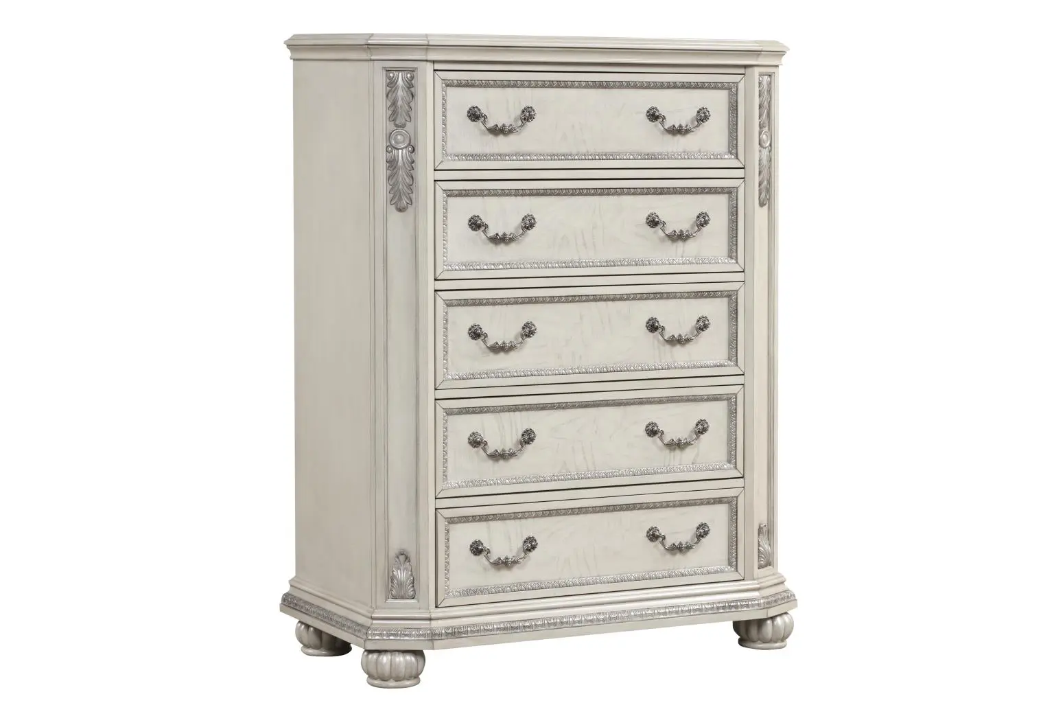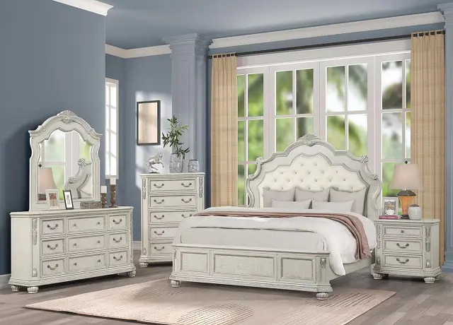 Classic design elements never go out of style the Florian collection is designed for the traditional home. The antique white finish gives off the right amount of distressing for a worn-in feel. The bed features a button-tufted portman-style headboard that is upholstered in a gray PU for added contrast. The footboard features raised panels to add visual interest. Case goods offer a natural wooden finish for contrast against the antique white finish. The drawers are full-extension and offer French dovetail fronts and English dovetail back construction. Comfortable, timeless, and stylish, the bed will bring a strong design presence to a room.