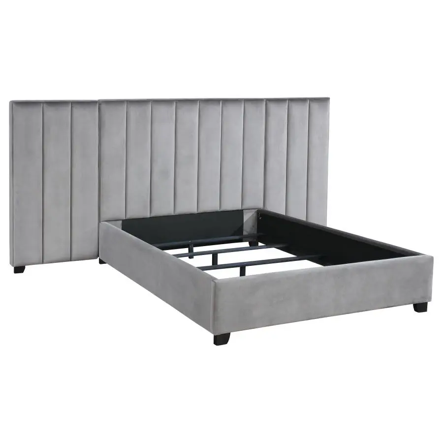 Contemporary and edgy style takes on a plush quality with upholstery fit for a comfy master or guest suite as this modern bed with side panels anchors a haven for ultimate relaxation. Add dimension and cool color to any bedroom with this platform bed and wrapped in cool gray velvet upholstery and embellished with two wide wall panels that dominate an integral wall. Vertical strips create geometric energy to wall panels backing a simply styled bed covered in gray velvet and sitting on petite black finish feet. A versatile yet timely palette invites surrounding case pieces tailored to personal taste. Set includes one bed and