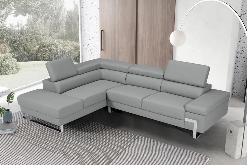 The sleek contemporary design of the Athena Sectional is magnified by the geometrically designed metal legs and the seats featuring a similar design.