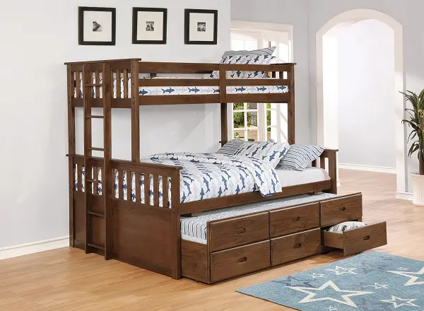 Loaded with versatile features, this bunk bed is sure to delight. With a twin bed up top, a full bed below, and a trundle tucked underneath, it comfortably sleeps multiple guests. A slatted wood design adds a touch of traditional charm. A weathered walnut finish give it a classic look.