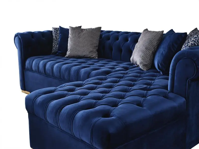 Lounge in luxurious style and comfort with this sleek Audrey blue velvet sectional. Featuring elegant, plush velvet upholstery and a deep tufted back, this sectional is a little piece of heaven for you to kick back and relax on. Double row chrome nailheads give the sectional a contemporary element, and a reversible chaise offers a comfortable place to kick up your feet after a long day. Pillows are included as well to add to your comfort.