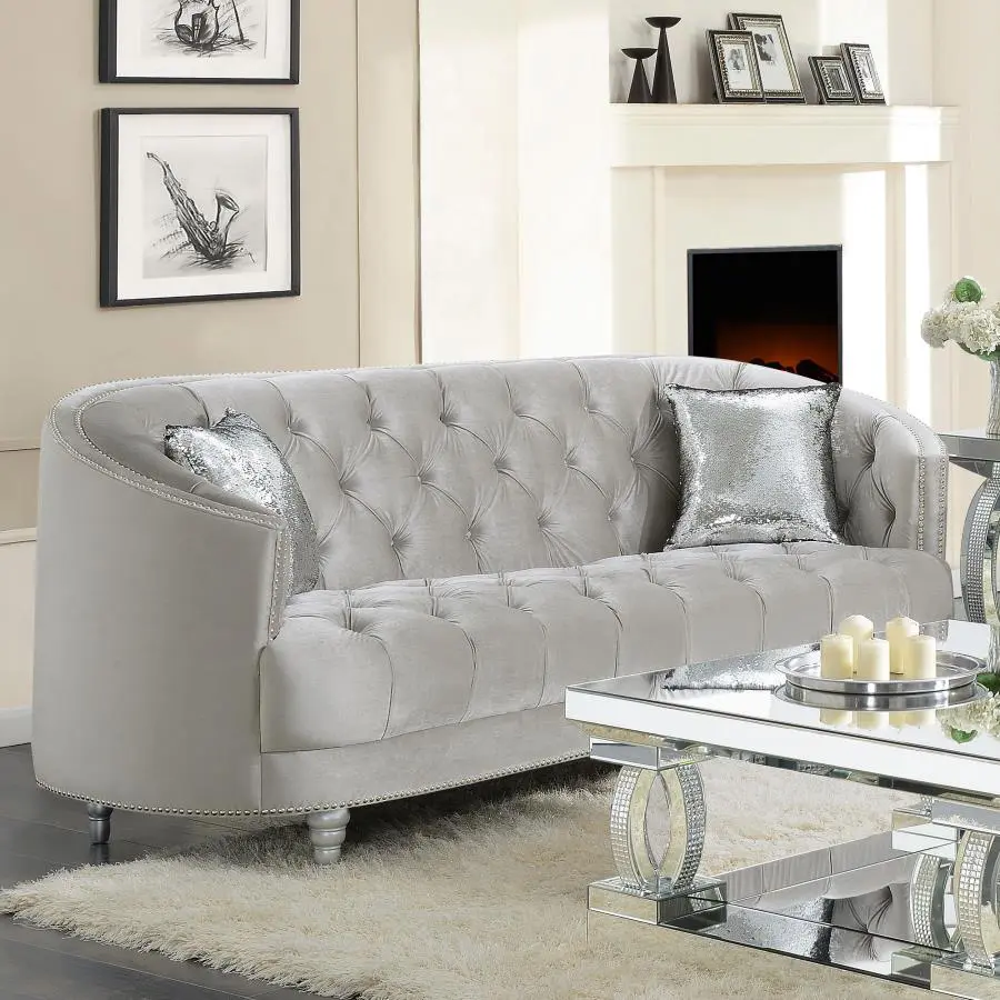 This loveseat envelops you in romantic style and luxury. The button-tufted design is timeless and classic. The wraparound seat back curves down to convenient armrest. Sink into thick cushions for hours peace and quiet while huddled with a book or a partner. Comes finished in impressive grey material that perfectly suits the decor in any living room.