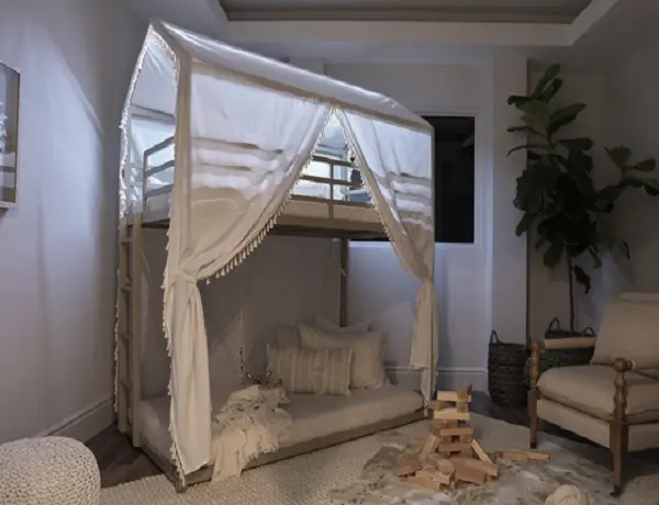 Sweet and charming, this double twin bunk bed is the perfect addition to a young girl’s bedroom. It’s house-like structure features a champagne finish for a touch of glam, as a tassel, beige linen-like fabric rests over it to create a calming getaway. Three-stage, touch-activated LED lights illuminate the canopy from beneath, adding a soothing glow. Top bunk guard rails and an attached ladder offer an extra bit of safety for your little ones. Place this bunk bed in a young child’s play area to spark their imagination.