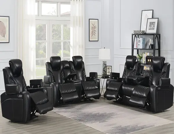 Delivering ultra-modern style and super cozy appeal, this power recliner set includes a sofa, loveseat, and chair, each of which offer loads of features, such as voice-activated controls for ultimate relaxation. Wrapped in a black top grain leather, this each recliner price offers everything from power headrests to massaging heated seats. In addition, this recliner lets you keep a refreshment or two nearby with its stainless steel cup holders. There is also convenient task lighting and a drop-down table for keeping snack on. Place this power recliner set in an entertainment room for a contemporary style.