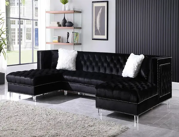 Black velvet design, deep tufting, double chaise sectional, pillows included, acrylic lucite legs, seat height 18.5″, seat depth 25.5″, 55″W between the chaises and each chaise is 35″W.