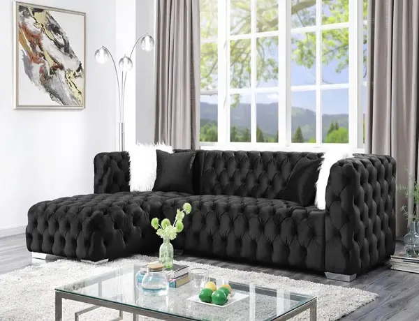 Features a velvet design, deep tufting, pillows  and chrome legs.