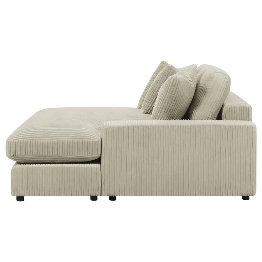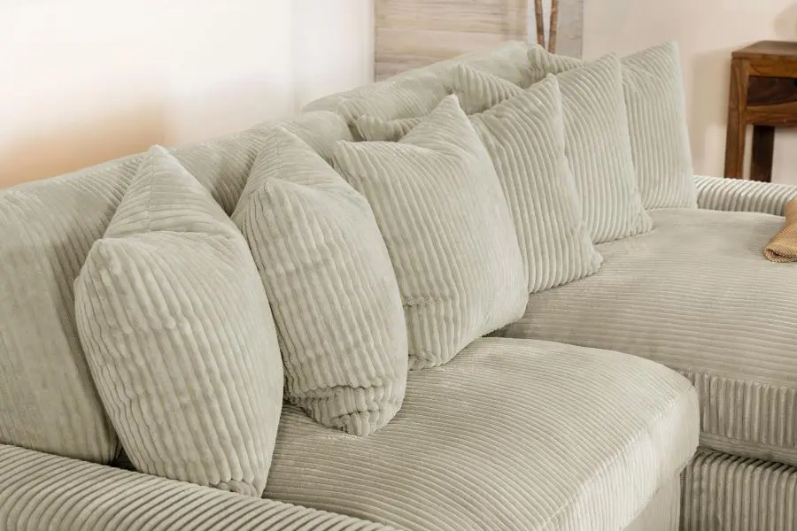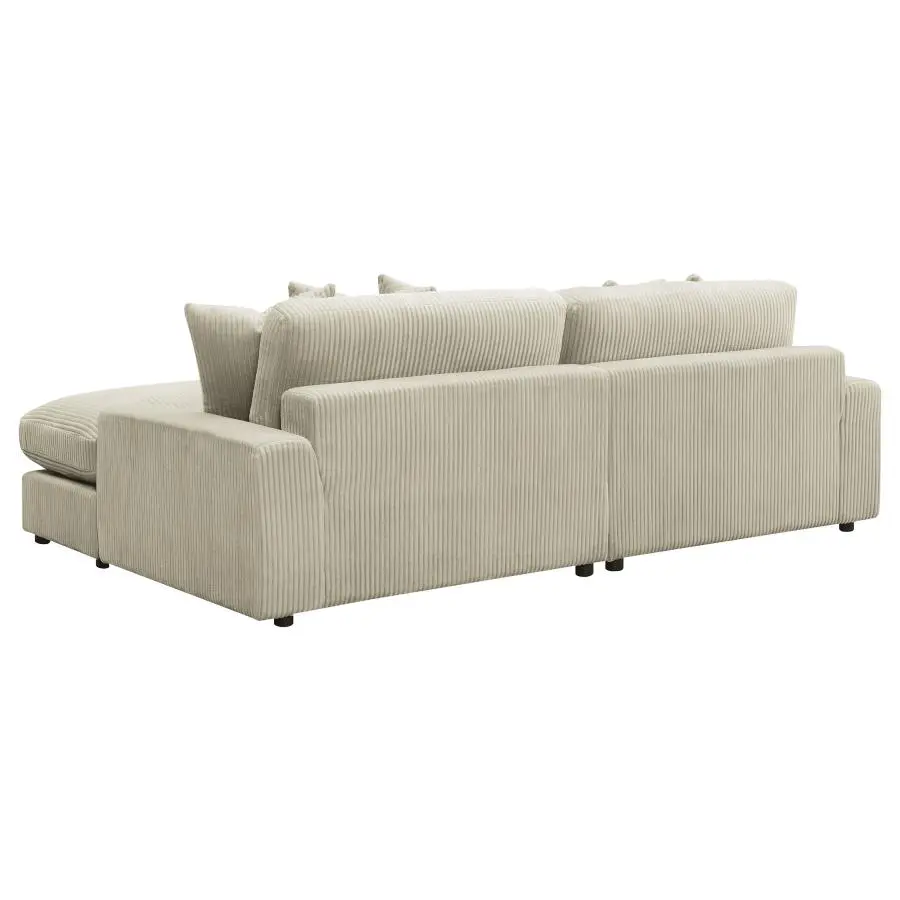 Add a retro-inspired look to your contemporary bedroom with this modern reversible sectional sofa, upholstered in a vintage-like wide corduroy performance fabric that offers a soft texture and an elegant fog tone. Each of the two pieces are appointed with reversible seats and back cushions that offer a versatile design, complete with wide track arms, black legs, and non-slip grips to hold everything in place.