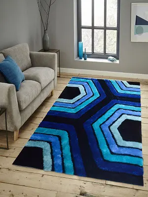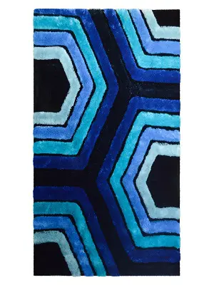 Shaggy rug in shades of blue colors. Modern Hexagon design.