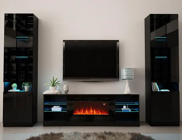 Modern Design. This is a beautiful product, perfect for you living fireplace came with a control to be able to regulate the lights and stones inside that simulate carbon. Have 2 Bookcases to ad more glamour  to your Home