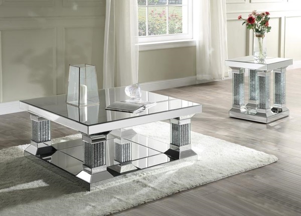 Caesia Coffee Table Collection modern glam style design finished in mirror featuring faux Gemstone Inlay Accents.