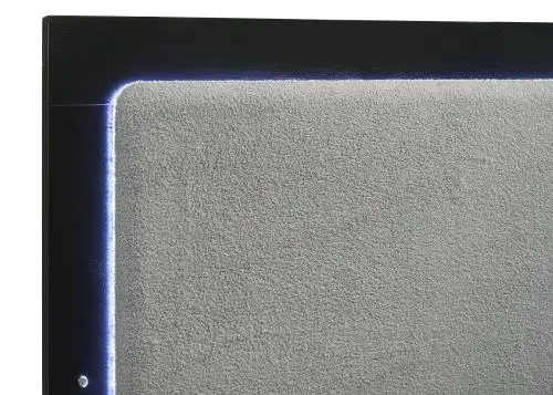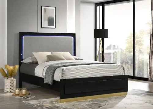 Modern luxury with a clean look offers a perfect fit for updated bedrooms as the bed anchors a sleek master suite or guest bedroom. Wood and wood products construct a bed with clean lines and an extra tall headboard that stands out to be noticed. Tech features fold LED strip lighting into its headboard, with a touch-activated light button on its front panel. This bed offers simplicity with sleek elegance, as straight legs and a headboard insert join a dimensional design element on its footboard. Choose this bed for its versatility and convenience, making a bedroom a haven for both sleep and serenity.