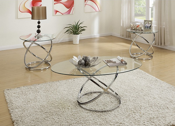 The illusion of two interlaced spinning circles supports the amazing 3-piece coffee table set that features crystal clear tabletops of sheer magnetic décor. 95″ W