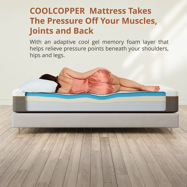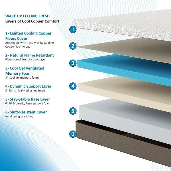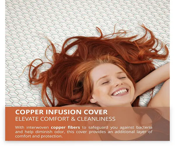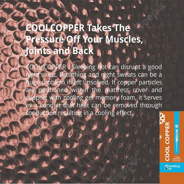 The cool copper fabric ions incite better circulation, natural cooling, speedy recovery, and antibacterial properties that ensure an undisturbed sleep.