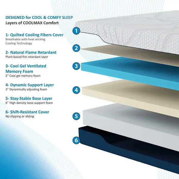 CertiPUR-US Certified & Made In USA – High-quality ventilated memory foam conforms to your body while the cool gel regulates body temperature; porous, open cell design allows for a greater circulation and meets CertiPUR-US program standards for performance, emissions, and durability. And it has plant-based fire retardant layer, no any fiber-glass.