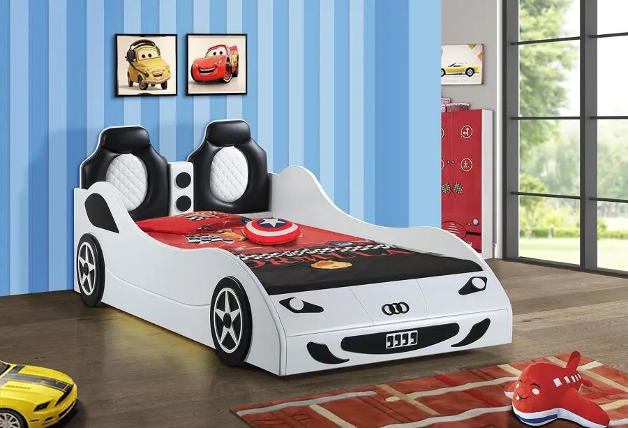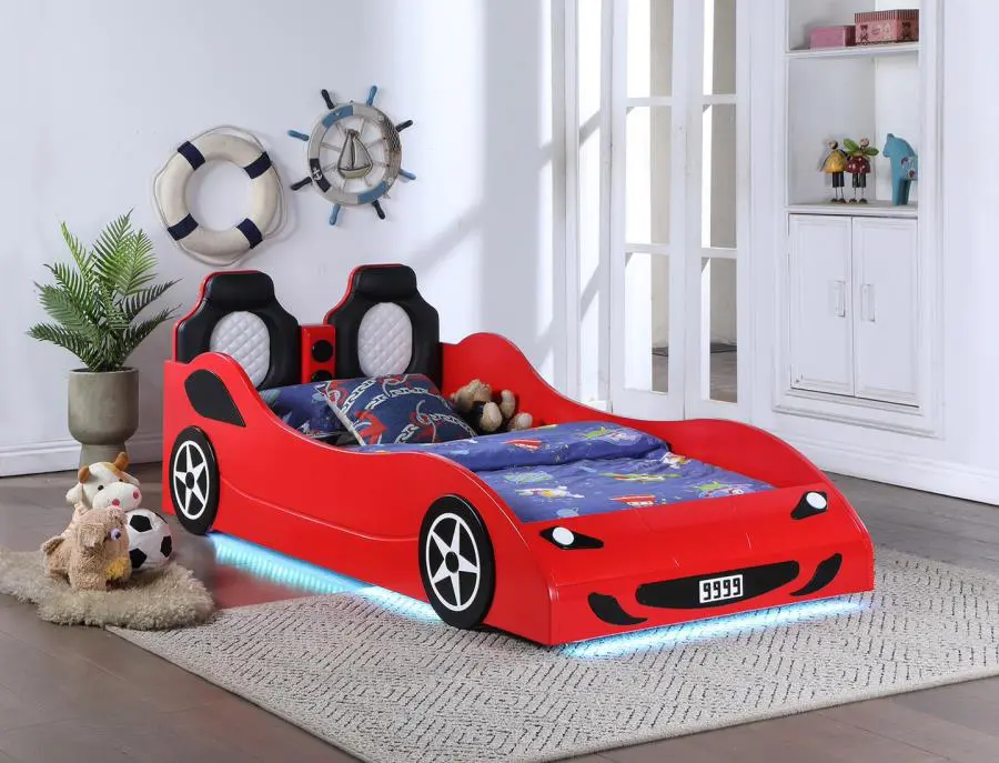 Modern race car aesthetics inform the design of a novelty car bed perfect for kids. Its twin size is versatile, allowing for plenty of space to play within the bedroom. The car is complete with realistic details and features LED strip lighting underneath, creating a fun glow that easily doubles as a nightlight for smaller kids. Curvy sides mimic the lines of a real race car while creating side rails that help keep restless sleepers from slipping out of bed in the night. Black decorative details finish the look, offering realism and whimsy.