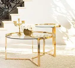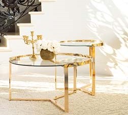 Add effortless elegance to any room in your home. This gorgeous, two-piece nesting table set exudes contemporary glamour. Each table features a gleaming metal base electroplated in gold for an alluring touch of style. Smooth, round tabletops crafted of tempered glass provide sturdy surface space with a touch of shine. These beautiful, glass top tables place together to save valuable square footage when not in use.