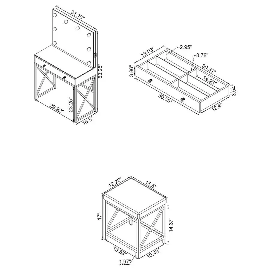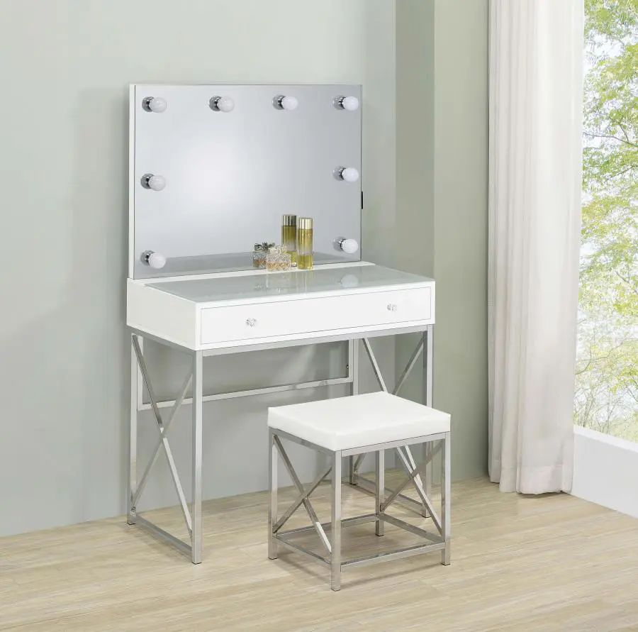 Elevate your morning rituals with a compact, contemporary vanity set, including table, mirror and stool. Perfect for makeup and hair, the vanity shows off a bright white finish with a large drawer for stashing your daily necessities. On top, a lighted mirror adds Hollywood glamour while providing bright illumination so you can see every detail as you get ready for everything from running errands to a girl’s night out. The desk is accompanied by a backless stool, providing an easy spot to sit as you prepare for the day. The stool features a base with X-shaped braces to match the desk and includes a white faux leather seat with lovely padding that starts your day on the right foot.