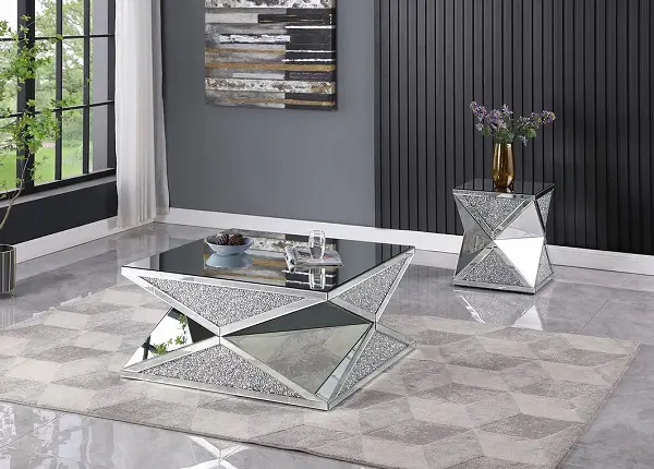 Amplify the style of a modern living room. This stunning coffee table livens up your living space with a hint of shimmering sparkle. Its base is artfully crafted into a diamond shape with alternating triangles of glittery and silvery material. A shining, reflective surface tops it off with an extra touch of glam. With an air of luxurious opulence, this table is an exquisite choice for a contemporary home.