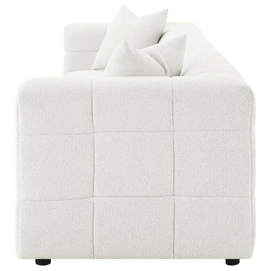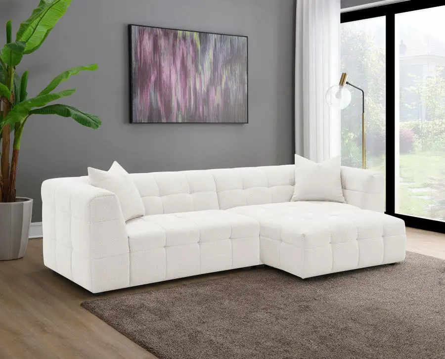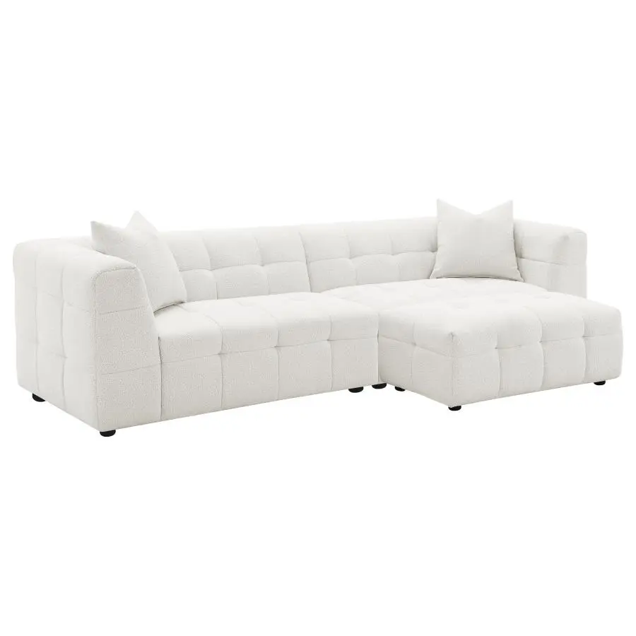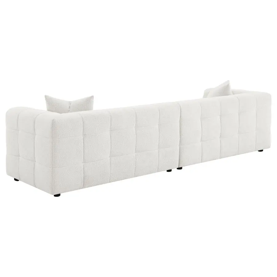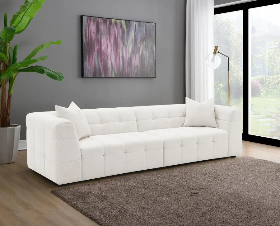 Introduce a touch of playful sophistication to your living space with this extra long 114-inch sofa. Designed for those who appreciate both style and comfort, this extra long sofa features fun geometric details, a detailed grid tufted design, and soft textured boucle upholstery. Wrapped in luxurious boucle fabric, the Sofa XL offers a plush and inviting seating experience, perfect for relaxing or entertaining. The included two pillows add an extra layer of comfort and style, making this sofa a standout piece in any room. Pair it perfectly with a reversible and functional ottoman to complete the ultimate lounging setup.
