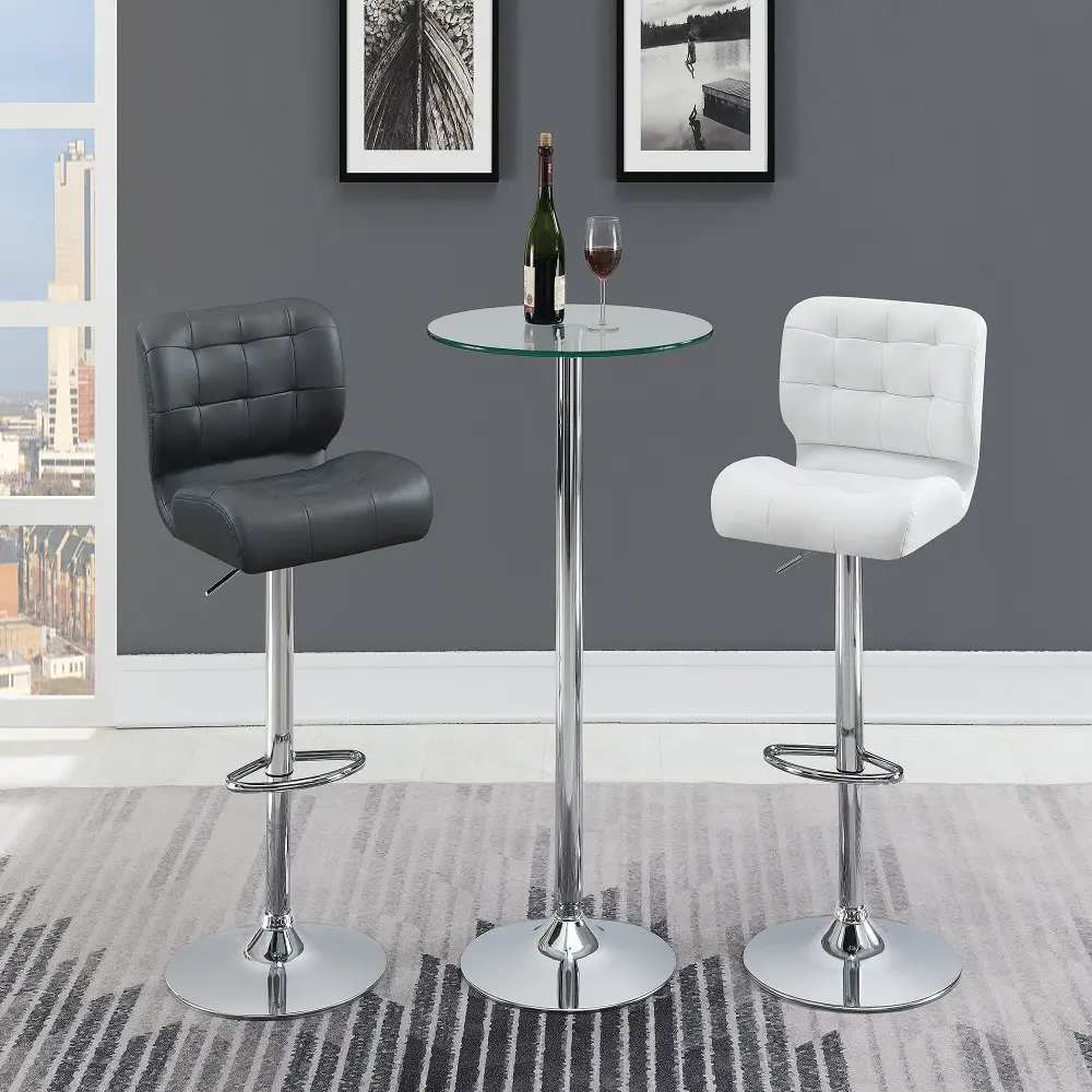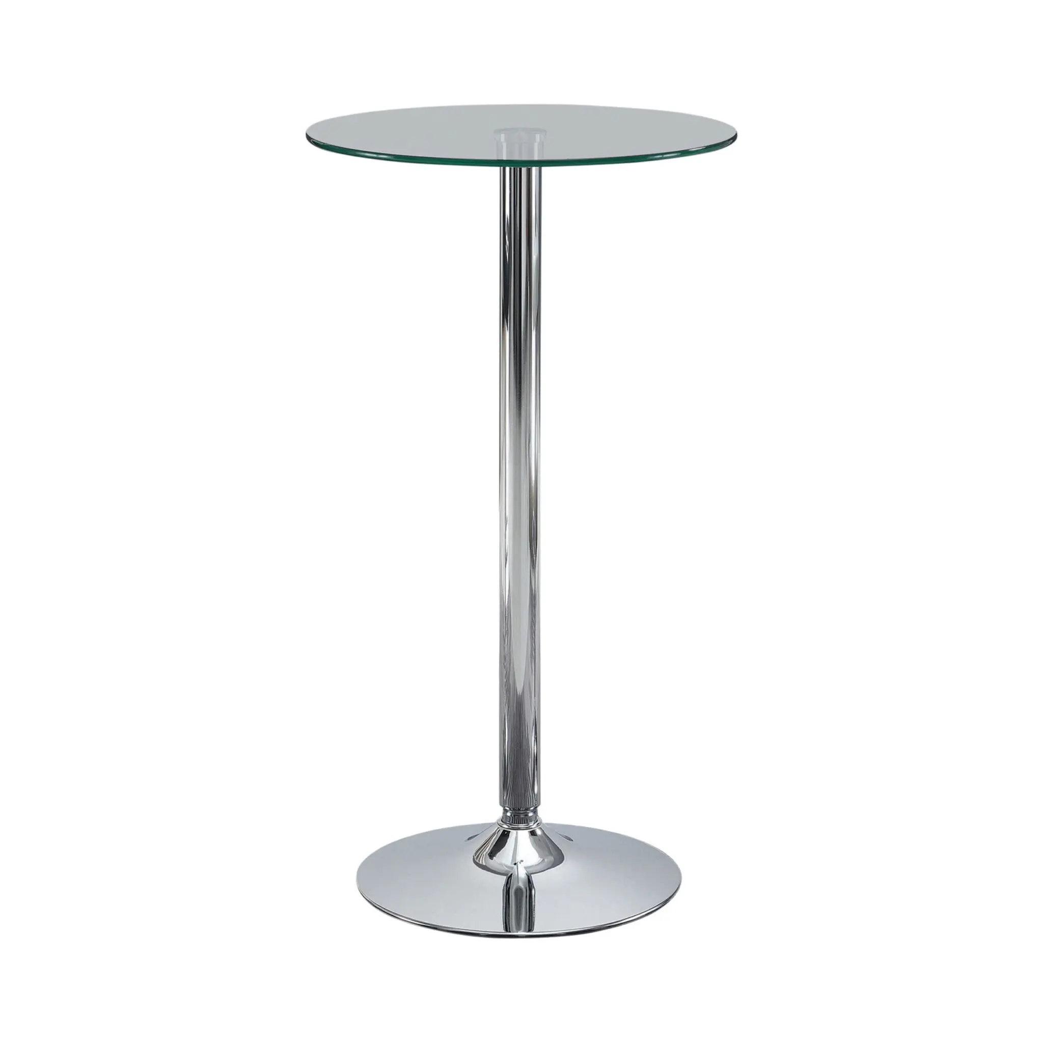 Sleek and modern, this round bar table is a beautiful addition to contemporary decor. Perfect in a small kitchen nook or in a home lounge, the table features a clear tempered glass tabletop ideal for drinks or appetizers. The glass creates a surface that looks great and is easy to maintain. A pedestal base features a round foot and gleaming chrome finish. Choose and equally elegant pair of barstools (sold separately) for a cool, sophisticated upgrade.