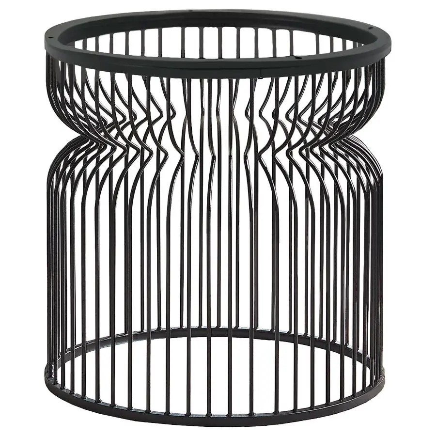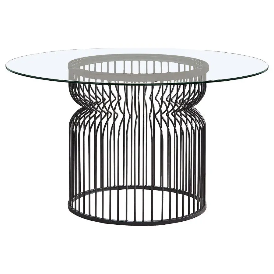 Versatile and stylish, this sculptural-like dining table features a stunning cage-style design. Round in shape with sleek, thin metal rods all around, it has a pinched top section that lends a softly curved edges and a supportive open base that sits flush to the floor. Made entirely of metal, this contemporary table base offers a dark gunmetal finish that can blend easily with existing colors and decor. In addition, this table base allows you to customize your table’s size, choosing from large beveled clear glass or even marble. Create the exact table you need!