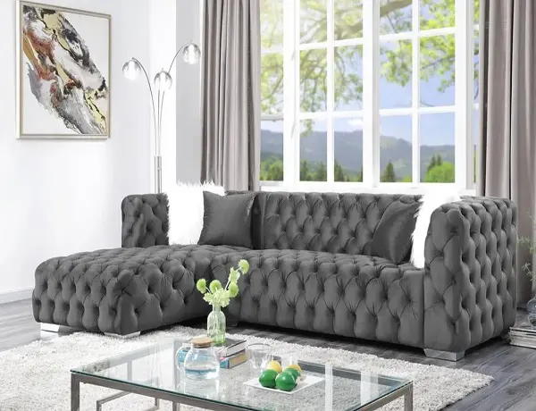 Features a velvet design, deep tufting, pillows  and chrome legs.
