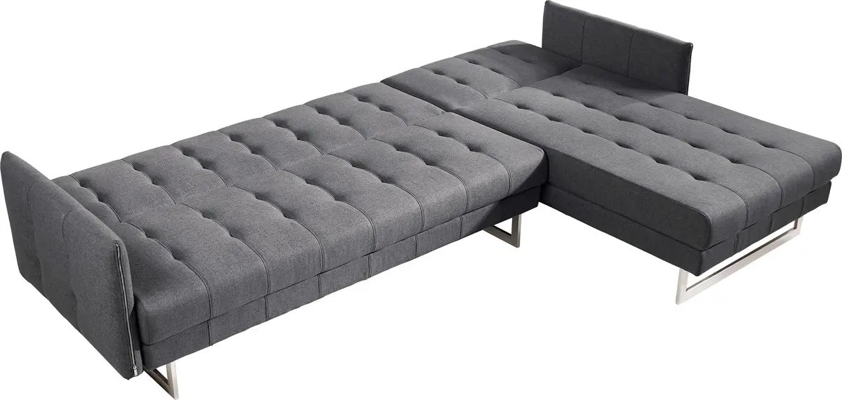 Beef up your living space with the Divani Casa Lennox Mid-Century Grey Fabric Sectional Sofa. Perfect for an open style home, this convertible sectional sofa makes your space conveniently functional. It features a sofa that easily opens to a bed and a right facing chaise with an adjustable backrest so it turns into a bed, too. Framed in solid wood and upholstered in 100% grey polyester fabric, this sectional sofa features tufted vertical stitching on the seats, backrests, and armrests with zipper accents. Rectangular metal legs provide sturdy support and balance. This multifunctional mid-century sectional sofa suits any home theme.