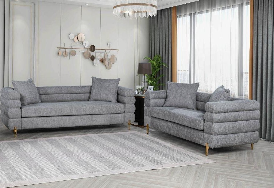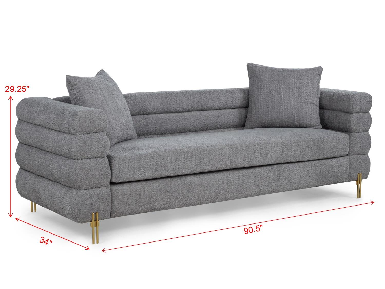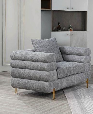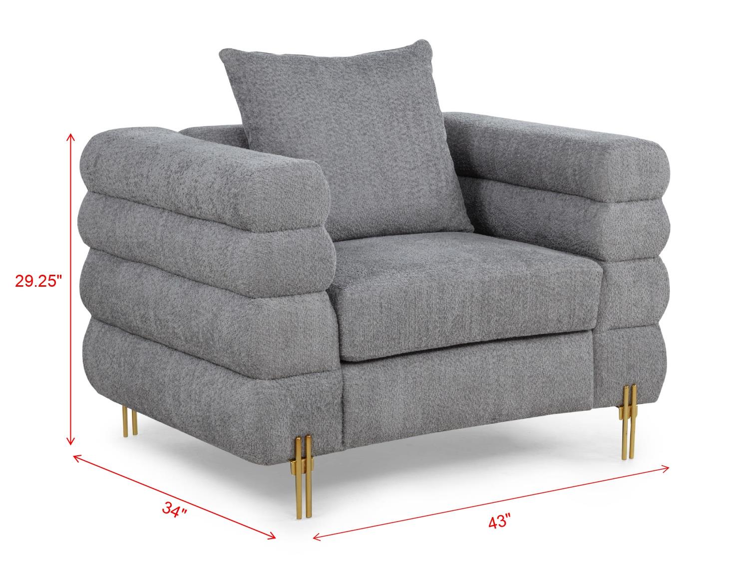 Elevate your living space with the complete modern sophistication of this sofa, loveseat, and chair set. Each piece features tube-like geometric sculptured track arms, offering a unique and stylish design that sets this set apart. Wrapped in beautiful grey boucle fabric, the set exudes elegance and provides an inviting seating experience. Supportive back cushions ensure comfort and can be easily flipped for even wear and extended use. Thin gold metal legs add to the modern appeal, creating a light and airy look while providing a sturdy foundation.