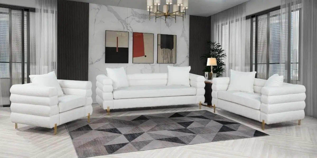 Elevate your living space with the complete modern sophistication of this sofa, loveseat, and chair set. Each piece features tube-like geometric sculptured track arms, offering a unique and stylish design that sets this set apart. Wrapped in beautiful white boucle fabric, the set exudes elegance and provides an inviting seating experience. Supportive  back cushions ensure comfort and can be easily flipped for even wear and extended use. Thin gold metal legs add to the modern appeal, creating a light and airy look while providing a sturdy foundation.
