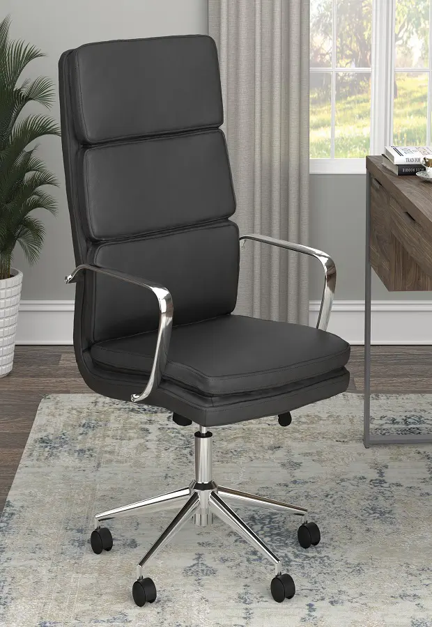 Update your workspace with this modern office chair. A chrome finish on the chair base and contoured arms are a modern touch as is the horizontal stitching on the seat back. This cushioned office chair features an ergonomically contoured back for ideal support and comfort, with armrests for added stability.