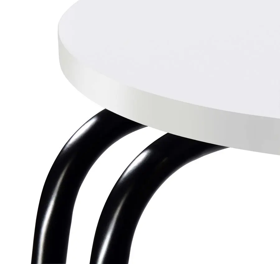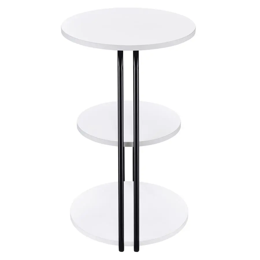 Put final touches on a modern living space with the sculpted flair of this contemporary accent table. The three-tier design is eye-catching and versatile, offering spaces for decor and essentials like a book or beverage. The table boasts a bright white finish over three tabletop surfaces, perfectly contrasting a black metal frame. The center shelf is a bit smaller than those on top and bottom, adding dimension and artistry in a sitting area or living room nook. Choose colorful accessories to make a splash in your living room.