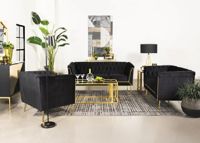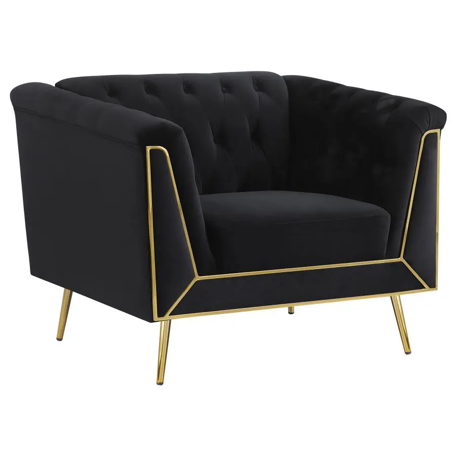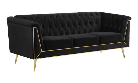 Instantly upscale your elegant living room with a two-piece modern glam sofa set. The sofa and loveseat show off lush, inviting black velvet upholstery, complete with button tufting that adds dimension to a vintage inspired silhouette. High arms add character and are accentuated with geometric metal trim work in a shiny gold finish to create wonderful contrast and detail. Matching legs are tapered and splayed, a perfect finishing touch. Sinuous springs and webbing provide support to plush seating, with foam cushioning for exceptional comfort and support.