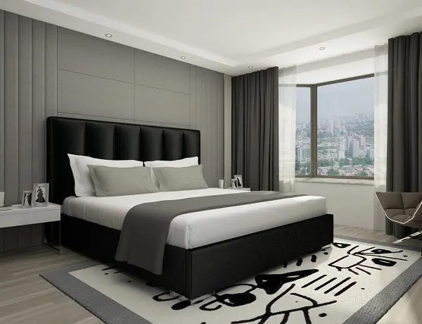 Velvet Bed Queen. Vertical lines design in the headboard. Fully upholstered in black velvet with stainless legs.