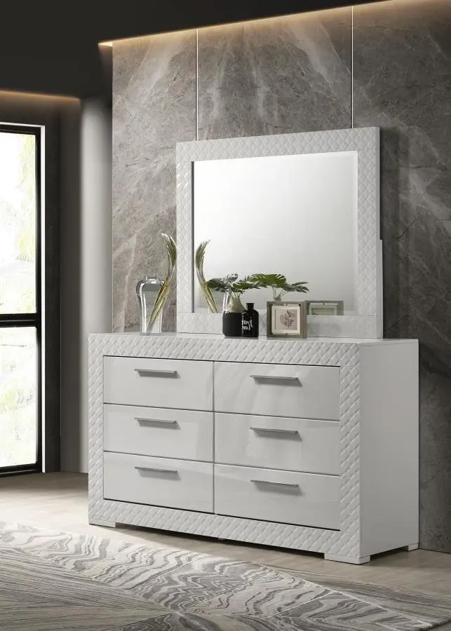 Create a cohesive and stylish look in your bedroom with this four-piece set, including a bed, nightstand, dresser, and mirror. The set features a high gloss finish and 3-dimensional diamond tile emboss, reflecting a contemporary Italian style. Each piece is crafted with quality materials and attention to detail, offering both beauty and functionality. The bed includes a touch LED light in the headboard, while the dresser and nightstand provide ample storage with felt-lined top drawers. This bedroom set is perfect for those seeking a modern and elegant aesthetic.