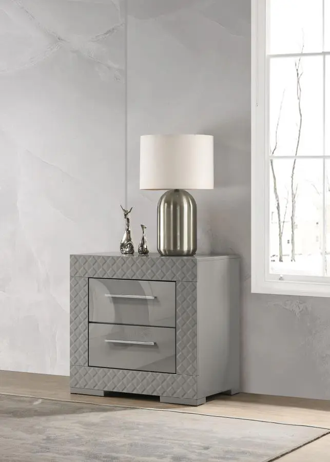 Create a cohesive and stylish look in your bedroom with this four-piece set, including a bed, nightstand, dresser, and mirror. The set features a high gloss finish and 3-dimensional diamond tile emboss, reflecting a contemporary Italian style. Each piece is crafted with quality materials and attention to detail, offering both beauty and functionality. The bed includes a touch LED light in the headboard, while the dresser and nightstand provide ample storage with felt-lined top drawers. This bedroom set is perfect for those seeking a modern and elegant aesthetic.