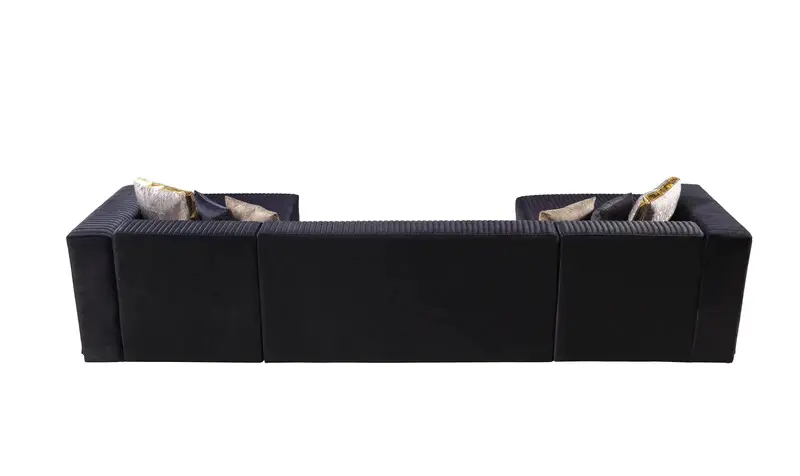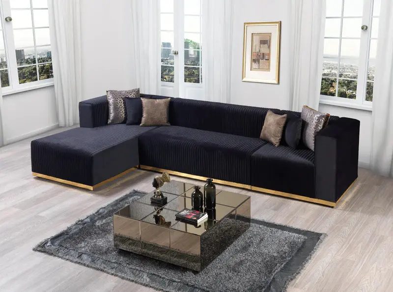 Get ready to relax after a long day with this Black Velvet 4pc. Sectional from Nova Furniture. Featuring rich velvet upholstery with deep tufting and comfy pillows, this double chaise sectional provides a luxurious, cozy space to kick back and watch TV, take a nap, or curl up with a nice book. Complete sets of gold and chrome legs complement your contemporary home decor while providing solid support for the sectional’s frame.