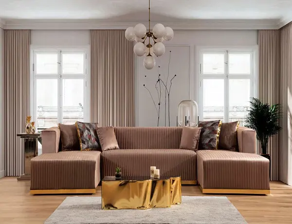 Get ready to relax after a long day with this Mocha Velvet 3pc. Sectional from Nova Furniture. Featuring rich velvet upholstery with deep tufting and comfy pillows, this double chaise sectional provides a luxurious, cozy space to kick back and watch TV, take a nap, or curl up with a nice book. Complete sets of gold and chrome legs complement your contemporary home decor while providing solid support for the sectional’s frame.