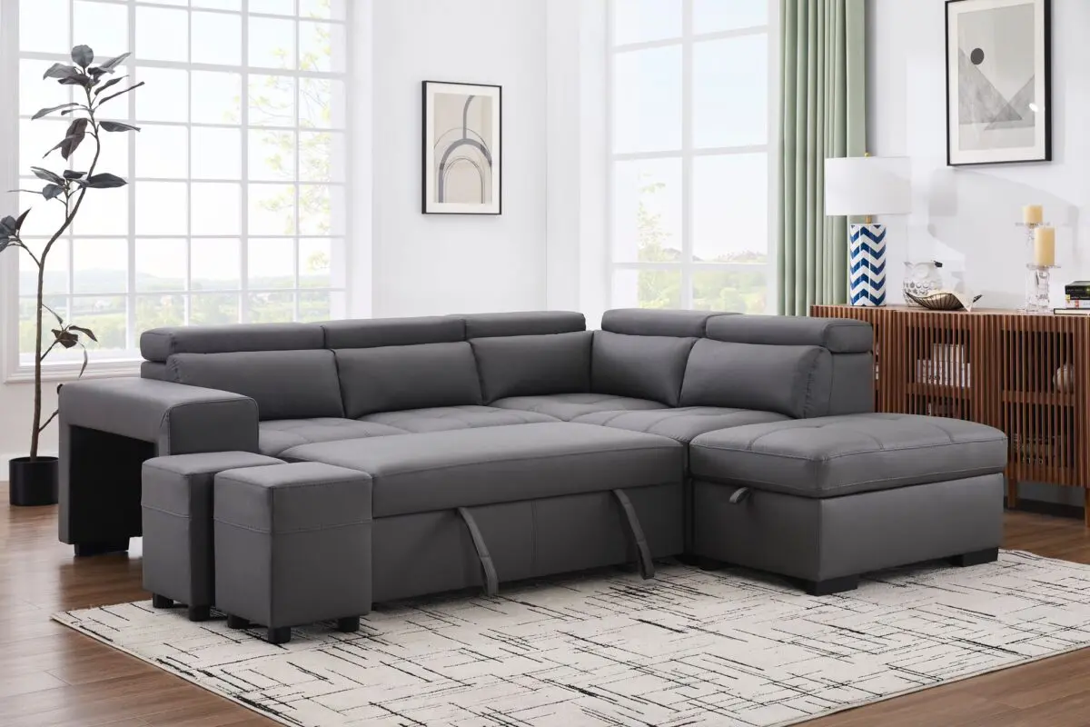 The Katerine sectional sofa provides ample space for snacking, snoozing, and relaxing! Upholstered in a sharp combo of grey fabric, this substantial shape sectional includes not only a pull-out sleeper with full foam mattress, but also a storage chaise.