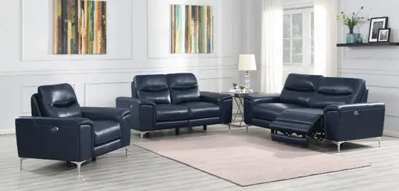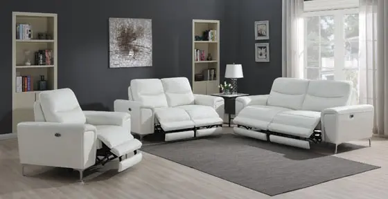 Bring back the luxury of first-class travel from an era of glamour with these power living room sets from the Largo collection. These pieces exude characteristic mid-century modern details with clean lines and bold track arms as well as slim polished stainless steel legs. Luxurious top grain leather is available in ink blue or crisp white to complement your decor, each with elegant stitching details. Relaxation is paramount, so we’ve included power reclining seats for custom comfort at the touch of a button. Crisper certified memory foam over a fully encased hardwood frame provides ultimate support and is built to last.