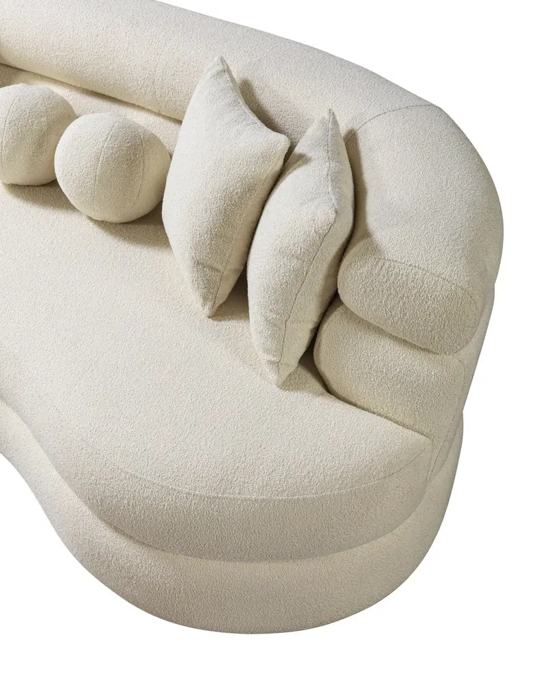 Introducing our Larissa Ivory Boucle  Curved Chaise, a perfect combination of style and comfort. Crafted with the utmost attention to detail, this sectional features luxurious boucle upholstery, known for its softness and texture. The Ivory color for this set is carefully selected to provide minimal yet post-modern look. Included with this extraordinary set are two pillows meticulously designed to complement the sectional’s aesthetic and provide additional support. Crafted to perfection, this sectional comes in three seamlessly integrated pieces.