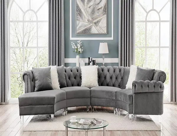Gray velvet design, chrome nailheads, deep tufting and acrylic lucite legs. Silver studs giving an elegant touch to this beautiful furniture and pillows included.