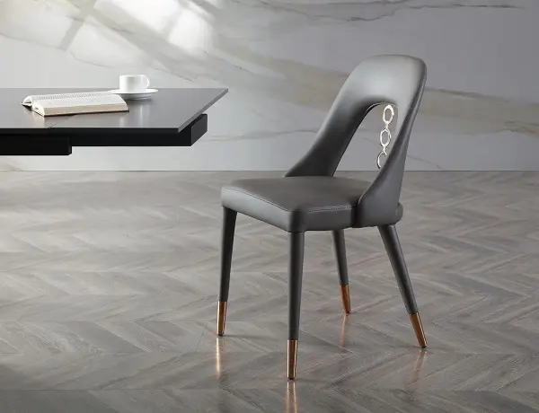 Liza Dining Chair. Fully Upholstered Faux Leather with Steel Frame. Feet Caps and 4 Rings on the Back in Rose Gold Stainless Steel. Sold in Sets of 2.