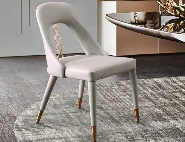 Liza Dining Chair. Fully Upholstered Faux Leather with Steel Frame. Feet Caps and 4 Rings on the Back in Rose Gold Stainless Steel. Sold in Sets of 2.