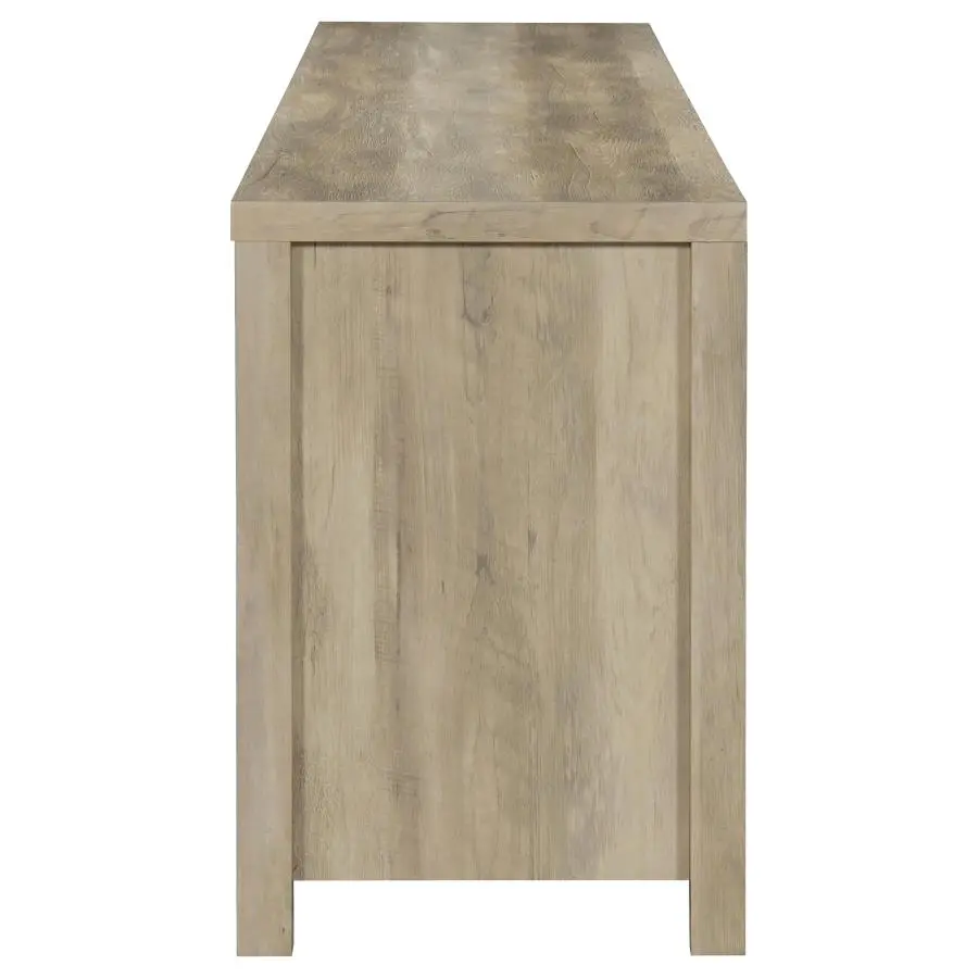 Wood-like finishes and country-inspired elements create this rustic style TV console. Keep entertainment consoles, a stereo and more tucked neatly within two open shelves toward the center. Disguised by sliding barn doors mounted on black hardware that lend an industrial touch, this television console also stores away entire collections of movies, games and music. With its long rectangular design and clean square edges, this console furniture piece makes an excellent addition to entertainment rooms and living rooms. This TV console makes a charming, versatile piece for your entire entertainment system setup.