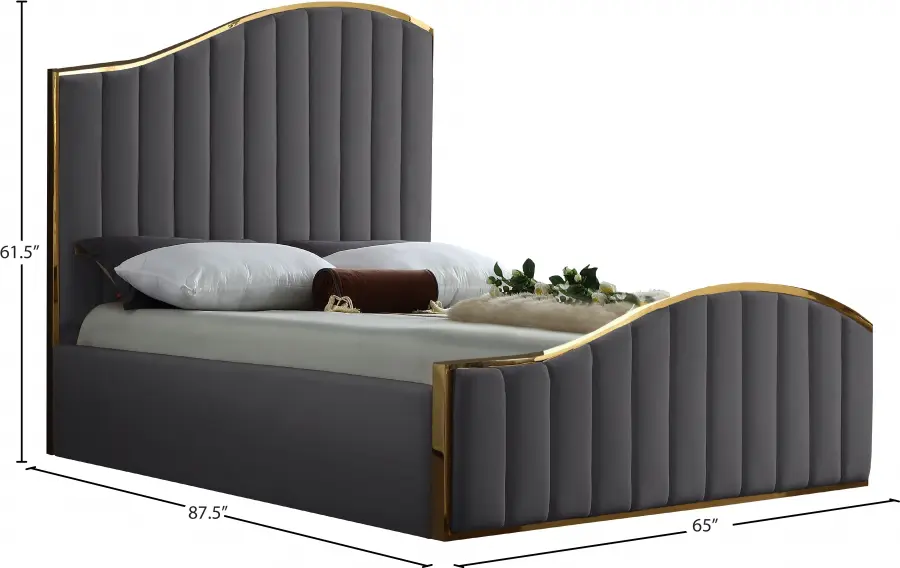 Transform your bedroom into a dream haven with the breathtaking Maya velvet bed. Featuring a stunning polished gold metal frame that supports green velvet upholstery on the headboard and footboard with channel tufting for texture, this sleek bed not only commands your attention, it demands it. The wavy design of the headboard and footboard evokes a dramatic image reminiscent of a boat rolling on the waves at sea, promising to lull you to sleep and reward you with a night of pleasant dreams.